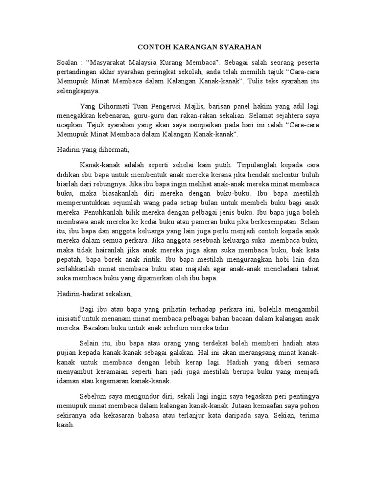 Karangan Syarahan Contoh 1 Kamu akan menyertai pertandingan syarahan yang dianjurkan oleh Persatuan Bahasa Malaysia sekolah kamu. Salam perpaduan bertatahkan intan kemesraan saya ucapkan kepada Tuan Pengerusi Majlis yang berbahagia puan pengetua Puan Lee Naib. BM STPM Karangan A Penulisan STPM.